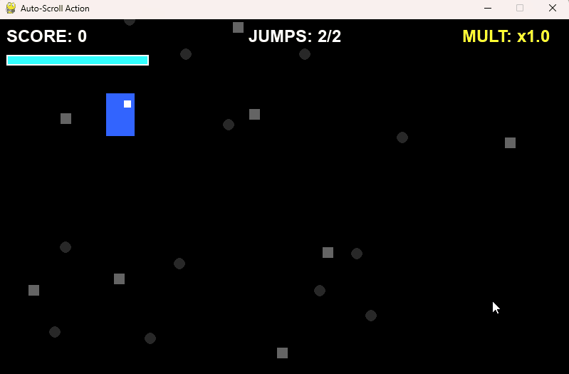 - 基本システム: 画面は強制的に右へスクロールしているように見せます(プレイヤーは画面左寄りに固定され、地形や障害物が右から左へ流れてくる形式)。